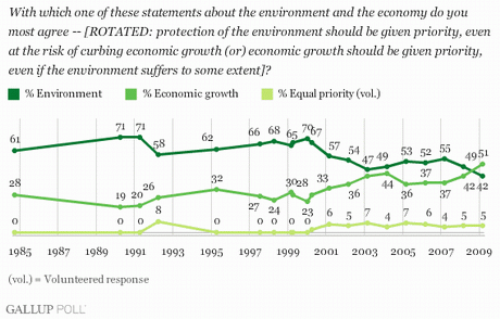 千真万确!据盖洛普Gallup 最新的调研,25年来,美国人第一次认为环境保护要让步于经济发展。