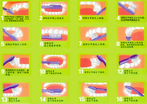 (4)顺序上述各种刷牙方法,在熟练的基础上也可以综合起来,例如先作水平颤动法,然后要作几下垂直颤动法,择其优点,保持口腔卫生。