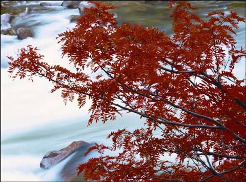 在这秋高气爽,云淡风轻之际,谁不乐意去看那晨如朝霞,暮似火云的红叶,绯红的三角枫婆娑起舞,绛红的青榨槭骚首弄姿,黄栌摆动如荼的手臂与绿波共舞,乌桕与桦木相伴,金黄流丹,独树一景。殷红的小柏果,以其珠圆玉润在翠绿中闪射出诱人的红光,青松林中的高山栎,以深沉的紫红在林海中,点出秋天的主题。斑斓的色彩与蓝天、白云、山川、河流,构成一幅幅醉人的金秋画卷。