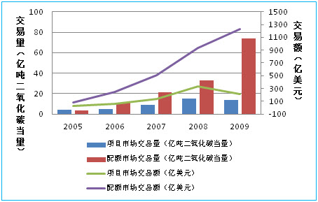 国际碳市场的交易经历了两个阶段:第一阶段为1996—2000年,第二阶段从2001年至今。在第一阶段,碳交易主要发生在非京都市场,即自愿市场或零售市场。交易数量呈现不规则波动,没有明显规律。第二阶段,碳交易由非京都市场向京都市场倾斜。京都市场主要由欧盟碳排放交易体系(EU ETS)、清洁发展机制(CDM)市场和联合履约(JI)市场组成。主要原因在于,减缓气候变化国际责任已达成共识,京都规则越来越受到重视。