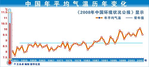 在公报中,人们欣喜地看到我国污染减排取得突破性进展,国家“多管齐下”为环保“护航”,然而环境形势仍十分严峻,从下图我们可以看出中国年平均气温在不断上升。